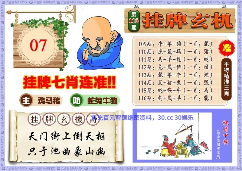 116期挂牌玄机:天门街上倒天枢,只于池曲象山幽 解:诗人以星象倒转的奇观(天枢)与山水幽深之景(池曲象山)相对比,可能表达对超然物外境界的向往,或暗含对自然规律与人文隐逸的思考 六肖:兔牛鸡羊鼠马 12码:15.27.29.41.21.33.23.35.18.30.12.24 平特一肖:马马马  |